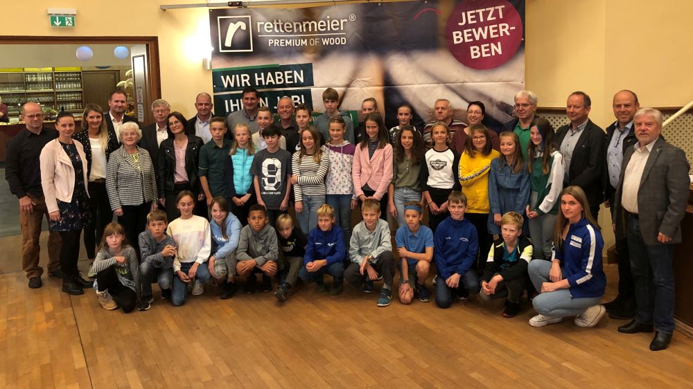 Hier im Bild die 29 jungen Athleten mit ihren Trainern und Förderern.