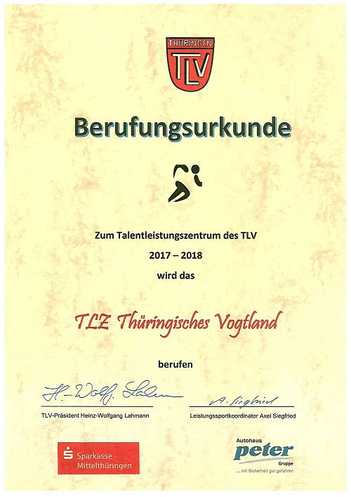 Am gestrigen Abend wurden im Intershop Tower Jena die thüringer Talentleistungszentren durch den Präsidenten des Thüringer Leichtathletikverbandes Heinz-Wolfgang Lahmann berufen. Auch unser TLZ erhielt die Berufungsurkunde für die Jahre 2017 - 2018.